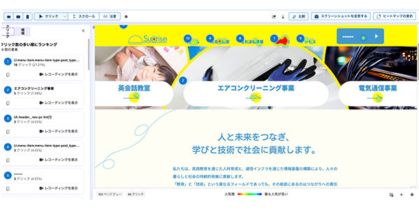 ユーザーがどこを見ているのか、どこをクリックしているのか、どこで離脱しているのかを、色や数値で可視化します。感覚ではなく、実際の行動データを見ることで、ユーザーの迷いや不便さ、興味の偏りが明確になります。