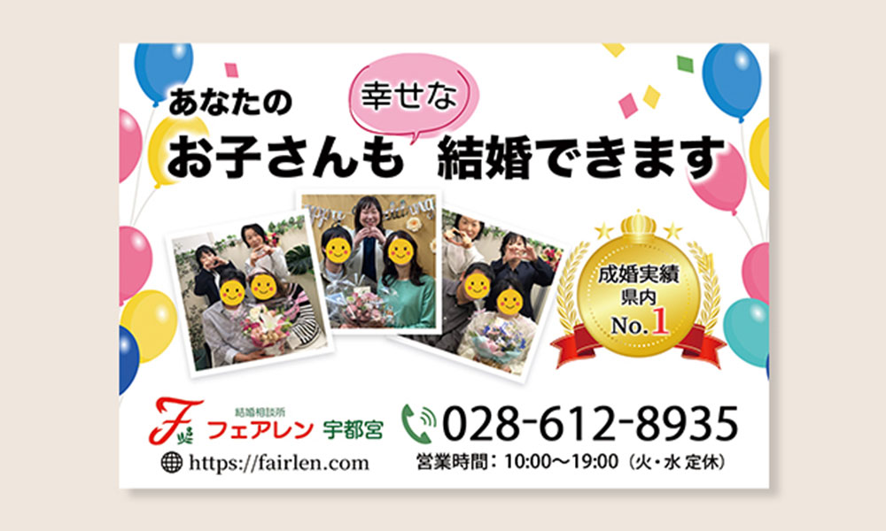 地元情報誌に掲載する結婚相談所の広告用バナーを制作いたしました。 50代以降の親(女性)の目を引くデザインにし、文字の視認性と信頼感も出しました。 制作期間:4日 使用ツール:Illustrator -